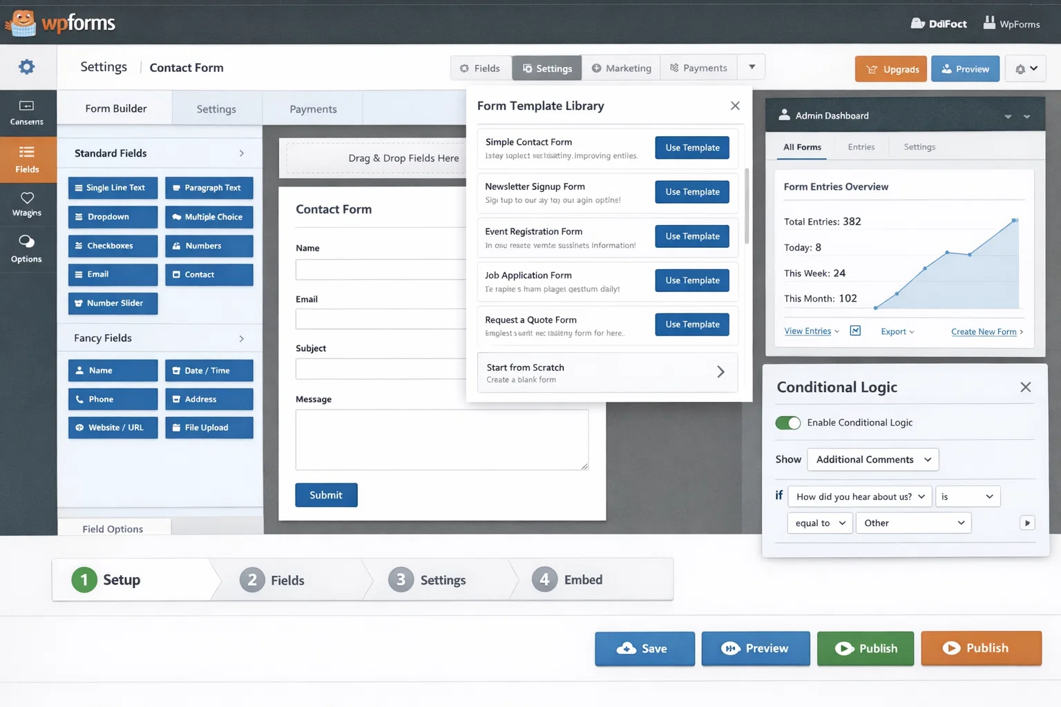 Beyond the basic contact form, the plugin you choose determines what’s possible for your site: multi-step forms for complex lead capture, payment collection for deposits or bookings, conditional logic that shows different fields based on previous answers, file upload for portfolio or application submissions, quiz forms, survey forms, and integrations with your CRM and email marketing tools.