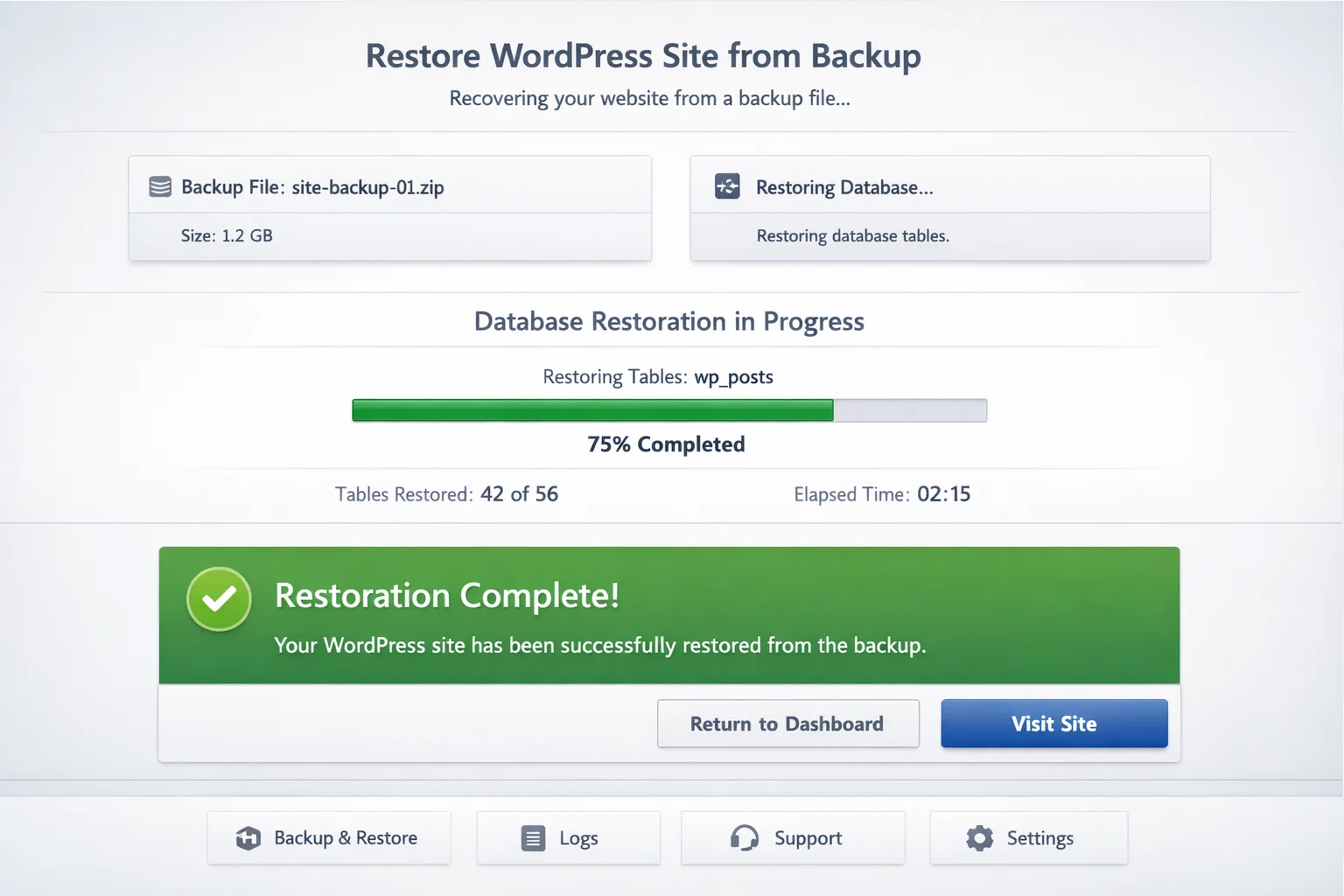 - Monthly restoration test – actually download and restore a backup to a staging site