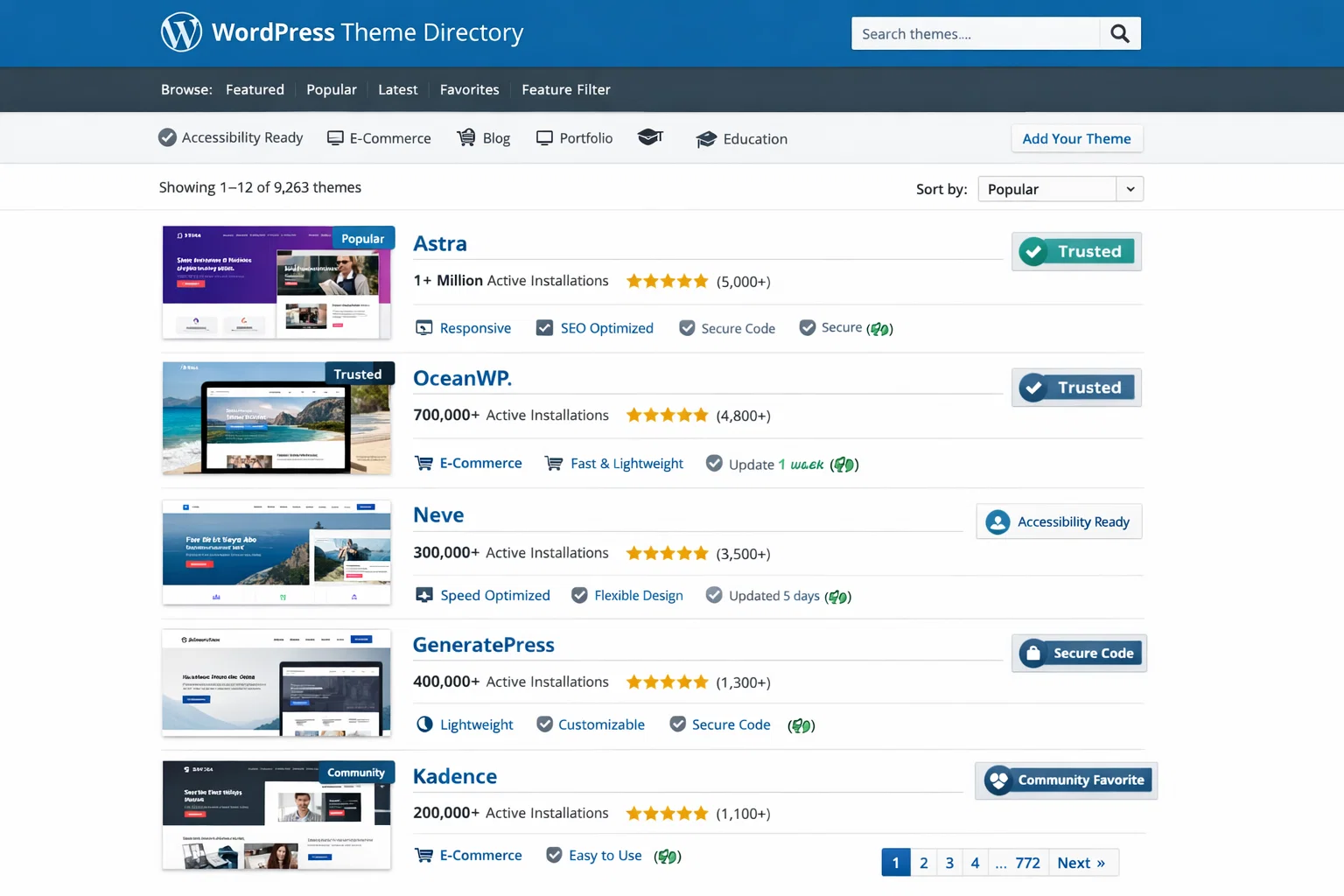 Astra, Kadence, Blocksy, and GeneratePress are all used on professional client sites regularly. They have the design quality, update cadence, and feature sets that client work requires. The main limitation is support – for client-facing issues, you’re relying on community forums rather than dedicated tickets.